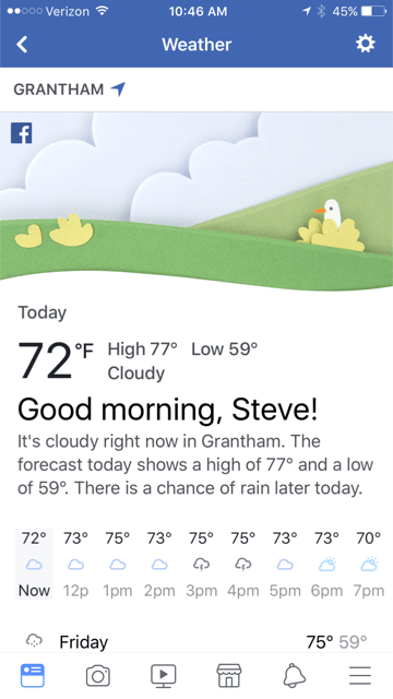 Facebook now automatically puts in my news feed the weather where I am, along with the extended forecast. A few weeks ago, Facebook offered me its new weather product. And like other weather apps, it follows me and allows me to set multiple locations. So now when I check Facebook, I always have the temp, the short range and 7-day forecast. It’s another step by Facebook to make its product one-stop content shopping –the social media/news version of product shopping Amazon. Do it all, get it all on one site.